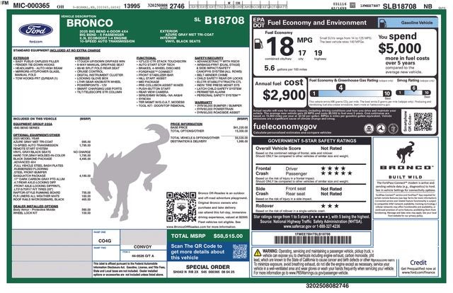 ***CALL NOW TO REQUEST A LIVE VIDEO WALK-AROUND OF THIS VEHICLE! WE'LL TEXT IT RIGHT TO YOUR PHONE!***APPOINTMENTS ARE RECOMMENDED DUE TO HGH VOLUME BUSINESS MODEL!*** Nick Mayer Ford West Avon Lake is proud to offer this gorgeous 2025 Ford Bronco in Azure Gray Metallic Tri-Coat This vehicle is ready to take home and comes with the following features; Black Diamond Package (Auxiliary Switches, LED Fog Lamps, Powder Coated Steel Front & Rear Bumpers, Rock Rails, Washout Capable Rubberized Flooring, and Wheels: 17 Black High Gloss Painted Aluminum), Equipment Group 222A Mid Package (2-Door Intelligent Access w/Lock/Unlock, Ambient Footwell Lighting, Connected Navigation, Dr & Pass Illuminated Sliding Visor Vanity Mirrors, Dual Smart Charging USB Ports, Dual-Zone Electronic Automatic Temperature Control, Front Row Heated Seats, Power Outlet - Back Side of Center Floor Console, and Rear Parking Sensors), Sasquatch Package (High Clearance Fender Flares, High Clearance Suspension, Position-Sensitive Bilstein Shock Absorbers, and Wheels: 17 Carbonized Gray Painted Aluminum), 4-Wheel Disc Brakes, 7 Speakers, ABS brakes, Air Conditioning, Alloy wheels, AM/FM radio: SiriusXM with 360L, AM/FM Stereo, Auto High-Beam Headlamps, Auto High-beam Headlights, Black Roof Rails w/Crossbars, BLIS Blind Spot Information System, Brake assist, Carbonized Gray Molded-In-Color Hard Top, Cloth Bucket Seats, Compass, Delay-off headlights, Driver door bin, Driver vanity mirror, Dual front impact airbags, Dual front side impact airbags, Electronic Stability Control, Emergency communication system: 911 Assist, Exterior Parking Camera Rear, Front & Rear Floor Liners w/o Carpet Floor Mats, Front anti-roll bar, Front Bucket Seats, Front Center Armrest, Front reading lights, Front wheel independent suspension, Fully automatic headlights, Heated door mirrors, Illuminated entry, Integrated roll-over protection, Internet access capable: FordPass Connect, Lane-Keeping System, Leather Shift Knob, Low tire pressure warning, Occupant sensing airbag, Outside temperature display, Overhead airbag, Overhead console, Panic alarm, Passenger door bin, Passenger vanity mirror, Power door mirrors, Power steering, Power windows, Pre-Collision Assist w/Automatic Emergency Braking, Radio data system, Raptor-Style Running Board, Rear-View Camera, Rear-Window Defroster & Washer, Remote keyless entry, Security system, SiriusXM w/360L, Speed control, Split folding rear seat, Steering wheel mounted audio controls, SYNC 4, Tachometer, Telescoping steering wheel, Tilt steering wheel, Traction control, Trip computer, Variably intermittent wipers, and Wheels: 17 Carbonized Gray-Painted Aluminum. Security System, Stability Control.