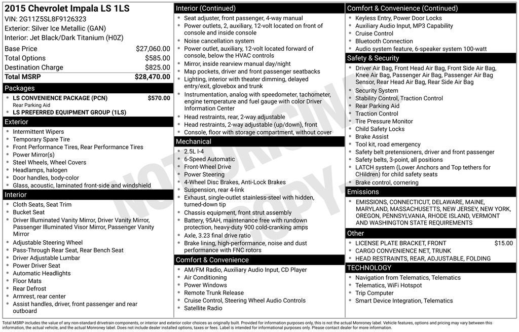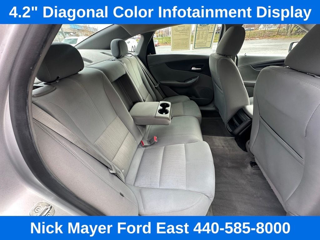 Nick Mayer Ford East Wickliffe is proud to offer this charming-looking 2015 Chevrolet Impala in Silver Ice Metallic This vehicle has been thoroughly inspected, ready to take home, and comes with the following features; LS Convenience Package (Adjustable Folding Rear Head Restraints, Rear Park Assist, and Trunk Cargo Convenience Net), Preferred Equipment Group 1LS, 100-Watt 6-Speaker System, 4.2 Diagonal Color Infotainment Display, Air Conditioning, AM/FM Stereo w/CD Player, Brake assist, CD player, Electronic Stability Control, Power driver seat, Remote keyless entry, SiriusXM Satellite Radio, Speed-sensing steering, USB Port, Wheels: 18 Steel w/Fascia-Spoke Covers, 4-Way Manual Front Passenger Seat Adjuster, 4-Wheel Disc Brakes, 6 Speakers, 8-Way Power Driver Seat Adjuster, ABS brakes, AM/FM radio: SiriusXM, Bumpers: body-color, Delay-off headlights, Driver door bin, Driver Power Lumbar Seat Adjuster, Driver vanity mirror, Dual front impact airbags, Dual front side impact airbags, Emergency communication system: OnStar Directions & Connections, Four wheel independent suspension, Front anti-roll bar, Front Bucket Seats, Front Center Armrest, Front License Plate Bracket, Front reading lights, Fully automatic headlights, Illuminated entry, Knee airbag, Low tire pressure warning, Occupant sensing airbag, Overhead airbag, Overhead console, Panic alarm, Passenger door bin, Passenger vanity mirror, Power door mirrors, Power steering, Power windows, Premium Cloth Seat Trim, Radio data system, Rear anti-roll bar, Rear reading lights, Rear seat center armrest, Rear side impact airbag, Rear window defroster, Security system, Speed control, Split folding rear seat, Steering wheel mounted audio controls, Tachometer, Telescoping steering wheel, Tilt steering wheel, Traction control, Trip computer, and Variably intermittent wipers.