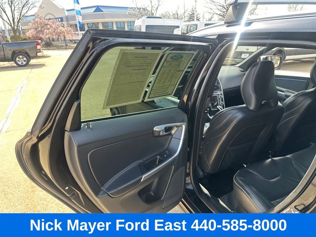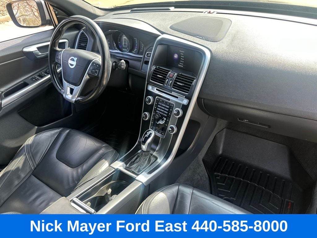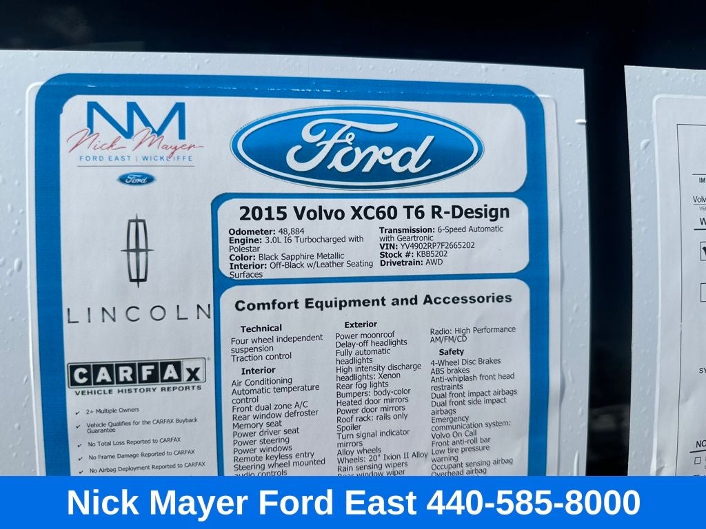 Nick Mayer Ford East Wickliffe is proud to offer this gorgeous 2015 Volvo XC60 in Black Sapphire Metallic This vehicle has been thoroughly inspected, ready to take home, and comes with the following features; AWD, 4-Wheel Disc Brakes, 8 Speakers, ABS brakes, Air Conditioning, Alloy wheels, AM/FM radio: SIRIUS, Anti-whiplash front head restraints, Auto-dimming Rear-View mirror, Automatic temperature control, Brake assist, Bumpers: body-color, CD player, Delay-off headlights, Driver door bin, Driver vanity mirror, Dual front impact airbags, Dual front side impact airbags, Electronic Stability Control, Emergency communication system: Volvo On Call, Four wheel independent suspension, Front anti-roll bar, Front Bucket Seats, Front Center Armrest, Front dual zone A/C, Front Embossed R-Design Sport Seats, Front reading lights, Fully automatic headlights, Heated door mirrors, High intensity discharge headlights: Xenon, Illuminated entry, Leather Shift Knob, Low tire pressure warning, Memory seat, Navigation System, Occupant sensing airbag, Outside temperature display, Overhead airbag, Panic alarm, Passenger door bin, Passenger vanity mirror, Power door mirrors, Power driver seat, Power moonroof, Power passenger seat, Power steering, Power windows, Premium audio system: Volvo Sensus, R-Design Sport Leather Seating Surfaces, Radio data system, Radio: High Performance AM/FM/CD, Rain sensing wipers, Rear anti-roll bar, Rear fog lights, Rear reading lights, Rear seat center armrest, Rear window defroster, Rear window wiper, Remote keyless entry, Roof rack: rails only, Security system, Sensus Navigation with Mapcare, Speed control, Split folding rear seat, Spoiler, Sport steering wheel, Steering wheel mounted audio controls, Tachometer, Telescoping steering wheel, Tilt steering wheel, Traction control, Trip computer, Turn signal indicator mirrors, Variably intermittent wipers, and Wheels: 20 Ixion II Alloy.