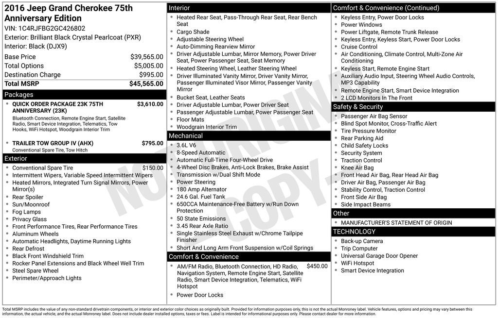 The exterior of this Grand Cherokee Limited exudes a bold, confident presence with its striking black paint, body-color accents, and distinctive Jeep 75th Anniversary styling cues. The interior pampers you with premium leather seating, Moroccan Sun and Tangerine accents, and a host of advanced technology features to keep you connected and entertained.