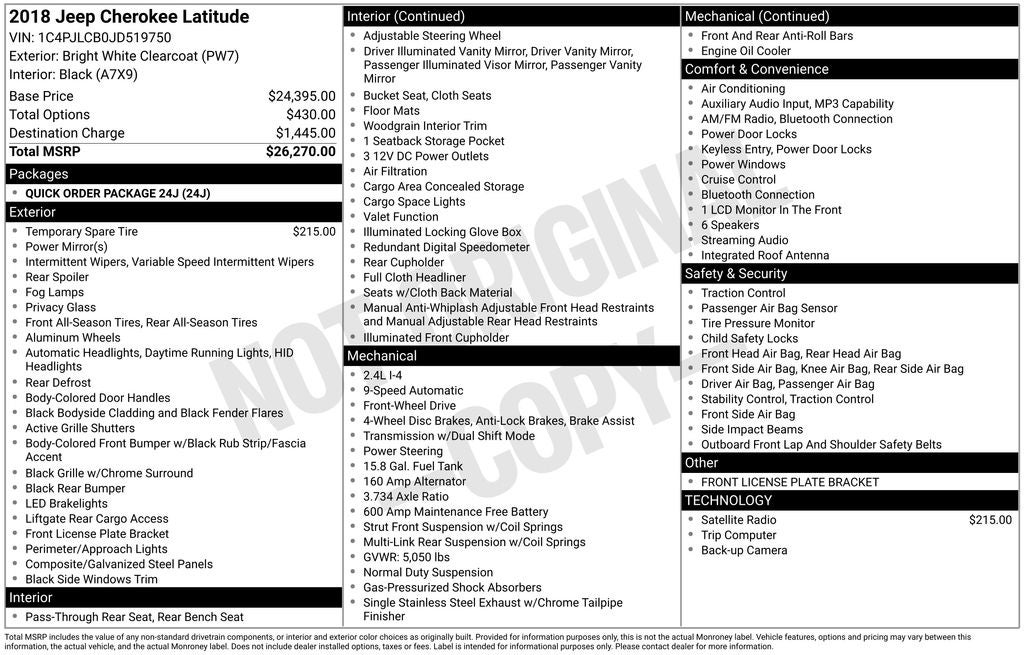 Under the hood, the 2.4L I4 engine and 9-Speed 948TE Automatic transmission deliver a smooth and efficient driving experience, with an impressive 30 highway MPG to keep you moving forward. The Jeep Cherokee Latitude's advanced features, including Bluetooth® connectivity, a rearview camera, and a premium audio system, ensure you stay connected and entertained throughout your journey.