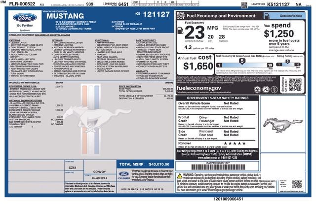 Boasting a stunning Blue exterior and an impressive EcoBoost 2.3L I4 GTDi DOHC Turbocharged VCT engine, this Mustang EcoBoost Premium delivers an exhilarating driving experience. With an EPA-estimated 20 MPG in the city and 28 MPG on the highway, this coupe offers an exceptional balance of power and efficiency.