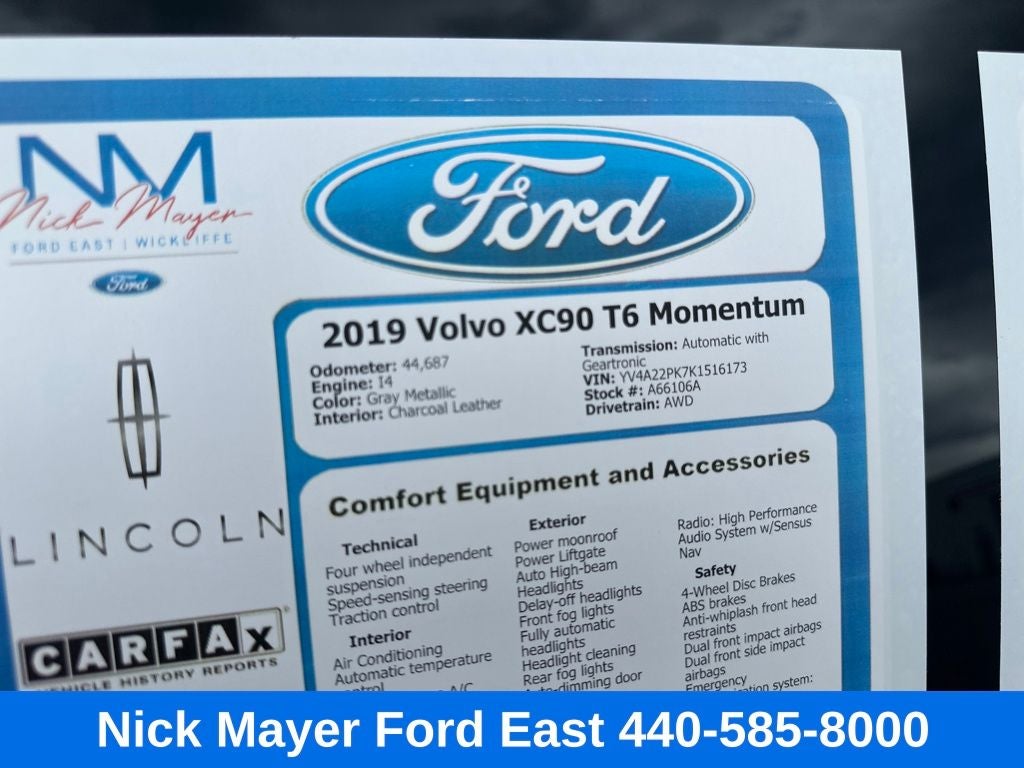 Nick Mayer Ford East Wickliffe is proud to offer this gorgeous 2019 Volvo XC90 in Gray Metallic This vehicle has been thoroughly inspected, ready to take home, and comes with the following features; Advanced Package (360 Degree Surroundview Camera, Full LED Headlights w/ABL, AHB2 & LED DRL, Graphical Head-Up Display (HUD), Headlight High Pressure Cleaning, and Park Assist Pilot & Front Park Assist), Heated Steering Wheel & Rear Seats (Heated Rear Seats, Outer Positions and Heated Steering Wheel), AWD, Charcoal Leather, 10 Speakers, 3rd row seats: bucket, 4-Wheel Disc Brakes, ABS brakes, Air Conditioning, Alloy wheels, AM/FM radio: SiriusXM, Anti-whiplash front head restraints, Apple CarPlay/Android Auto, Auto High-beam Headlights, Auto-dimming door mirrors, Auto-dimming Rear-View mirror, Automatic temperature control, Brake assist, Bumpers: body-color, Delay-off headlights, Driver door bin, Driver vanity mirror, Dual front impact airbags, Dual front side impact airbags, Electronic Stability Control, Emergency communication system: Volvo On-Call, Exterior Parking Camera Rear, Four wheel independent suspension, Front anti-roll bar, Front Bucket Seats, Front Center Armrest w/Storage, Front dual zone A/C, Front fog lights, Front reading lights, Fully automatic headlights, Garage door transmitter: HomeLink, Headlight cleaning, Heated door mirrors, Heated Front Bucket Seats, Heated front seats, Illuminated entry, Knee airbag, Leather Seating Surfaces w/Charcoal Interior, Leather Shift Knob, Low tire pressure warning, Memory seat, Navigation System, Occupant sensing airbag, Outside temperature display, Overhead airbag, Panic alarm, Passenger door bin, Passenger vanity mirror, Power door mirrors, Power driver seat, Power Liftgate, Power moonroof, Power passenger seat, Power steering, Power windows, Premium audio system: Sensus Connect, Radio data system, Radio: High Performance Audio System w/Sensus Nav, Rain sensing wipers, Rear air conditioning, Rear anti-roll bar, Rear dual zone A/C, Rear fog lights, Rear reading lights, Rear seat center armrest, Rear window defroster, Rear window wiper, Remote keyless entry, Roof rack: rails only, Security system, Speed control, Speed-sensing steering, Split folding rear seat, Spoiler, Steering wheel mounted audio controls, Tachometer, Telescoping steering wheel, Tilt steering wheel, Traction control, Trip computer, Turn signal indicator mirrors, Variably intermittent wipers, Wheels: 19 10-Spoke Turbine in Silver Bright, and Wheels: 20 5-Double Spoke Alloy Matte Tech Black.