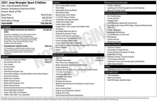 Discover the perfect blend of rugged capability and modern technology with the 2021 Jeep Wrangler Sport S. This vehicle has been carefully inspected and is ready to take you on your next adventure. Don't miss your chance to make this iconic Jeep your own.