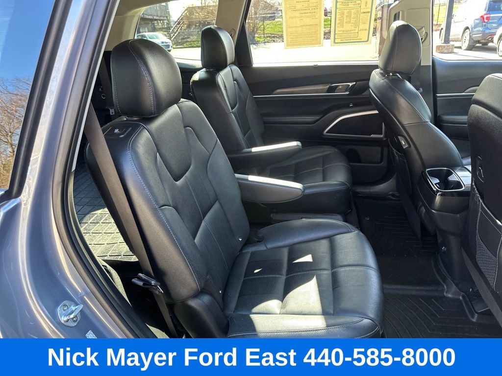 Nick Mayer Ford East Wickliffe is proud to offer this charming 2021 Kia Telluride in Everlasting Silver This vehicle has been thoroughly inspected, ready to take home, and comes with the following features; EX Premium Package (2nd Row Captain Chairs, LED Headlamps, Satin Chrome Roof Rails, and Wheels: 7.5 x 20 Machined Finish Alloy), Towing Package (Self Leveling Rear Suspension and Tow Hitch w/Harness (TOF)), 3.648 Axle Ratio, 3rd row seats: split-bench, 4-Wheel Disc Brakes, 6 Speakers, ABS brakes, Air Conditioning, Alloy wheels, AM/FM radio: SiriusXM, Apple CarPlay & Android Auto, Auto-dimming Rear-View mirror, Automatic temperature control, Brake assist, Bumpers: body-color, Carpeted Floor Mats, Compass, Delay-off headlights, Driver door bin, Driver vanity mirror, Dual front impact airbags, Dual front side impact airbags, Electronic Stability Control, Emergency communication system: 911 Connect, Four wheel independent suspension, Front anti-roll bar, Front Bucket Seats, Front Center Armrest, Front dual zone A/C, Front reading lights, Fully automatic headlights, Heated & Ventilated Front Bucket Seats, Heated door mirrors, Heated front seats, Heated steering wheel, Illuminated entry, Knee airbag, Leather Seat Trim, Leather Shift Knob, Leather steering wheel, Low tire pressure warning, Navigation System, Occupant sensing airbag, Outside temperature display, Overhead airbag, Overhead console, Panic alarm, Passenger door bin, Passenger vanity mirror, Power door mirrors, Power driver seat, Power Liftgate, Power moonroof, Power passenger seat, Power steering, Power windows, Radio data system, Radio: AM/FM/SIRIUS Display Audio, Rear air conditioning, Rear anti-roll bar, Rear audio controls, Rear reading lights, Rear seat center armrest, Rear window defroster, Rear window wiper, Reclining 3rd row seat, Remote keyless entry, Roof rack: rails only, Security system, Smart Key w/ Push Button and Remote Start, Speed control, Speed-sensing steering, Split folding rear seat, Spoiler, Steering wheel mounted audio controls, Tachometer, Telescoping steering wheel, Tilt steering wheel, Traction control, Trip computer, Turn signal indicator mirrors, Variably intermittent wipers, Ventilated front seats, and Wheels: 7.5 x 18 Machined Finish Alloy.