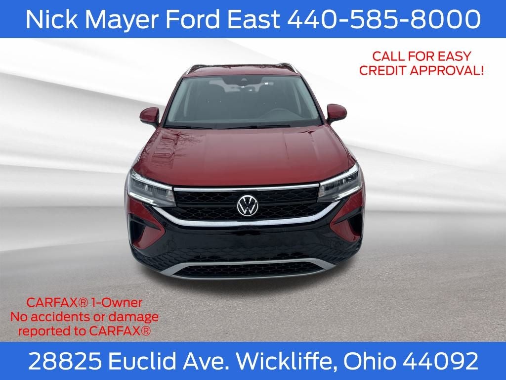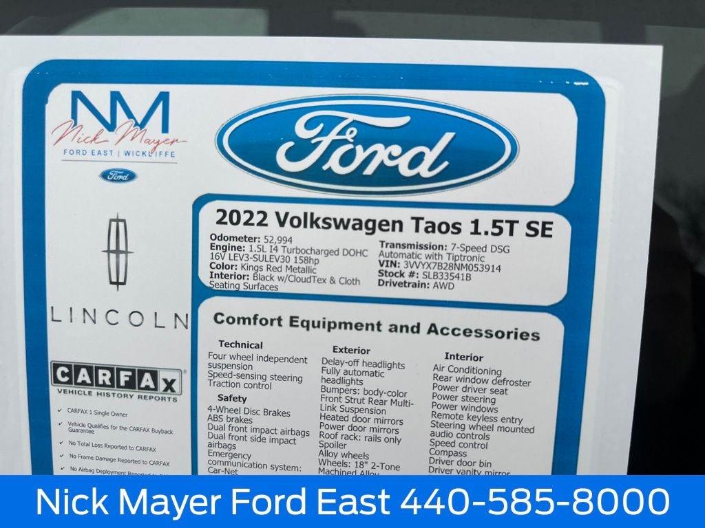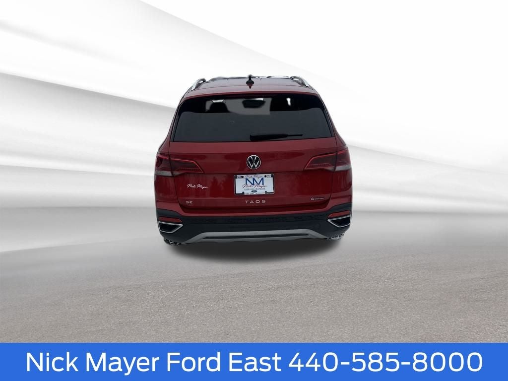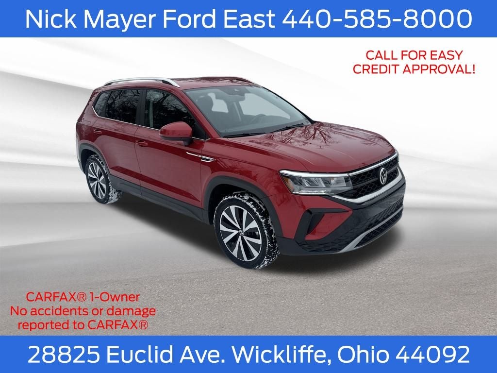 Nick Mayer Ford East Wickliffe is proud to offer this superb 2022 Volkswagen Taos in Kings Red Metallic This vehicle has been thoroughly inspected, ready to take home, and comes with the following features; 4-Wheel Disc Brakes, 5.20 Axle Ratio, 6 Speakers, ABS brakes, Air Conditioning, Alloy wheels, AM/FM radio: SiriusXM with 360L, Brake assist, Bumpers: body-color, CloudTex & Cloth Seating Surfaces, Compass, Delay-off headlights, Driver door bin, Driver vanity mirror, Dual front impact airbags, Dual front side impact airbags, Electronic Stability Control, Emergency communication system: Car-Net, Exterior Parking Camera Rear, Four wheel independent suspension, Front anti-roll bar, Front Assist, Front Bucket Seats, Front Center Armrest, Front reading lights, Front Strut Rear Multi-Link Suspension, Fully automatic headlights, Heated door mirrors, Heated Front Comfort Seats, Heated front seats, Illuminated entry, Leather Shift Knob, Low tire pressure warning, Occupant sensing airbag, Outside temperature display, Overhead airbag, Overhead console, Panic alarm, Passenger door bin, Passenger vanity mirror, Power door mirrors, Power driver seat, Power steering, Power windows, Radio data system, Radio: MIB3 Composition Media AM/FM/HD, Rear anti-roll bar, Rear seat center armrest, Rear Traffic Alert, Rear window defroster, Rear window wiper, Remote keyless entry, Roof rack: rails only, Security system, Speed control, Speed-sensing steering, Split folding rear seat, Spoiler, Steering wheel mounted audio controls, Tachometer, Telescoping steering wheel, Tilt steering wheel, Traction control, Trip computer, Variably intermittent wipers, and Wheels: 18 2-Tone Machined Alloy.
