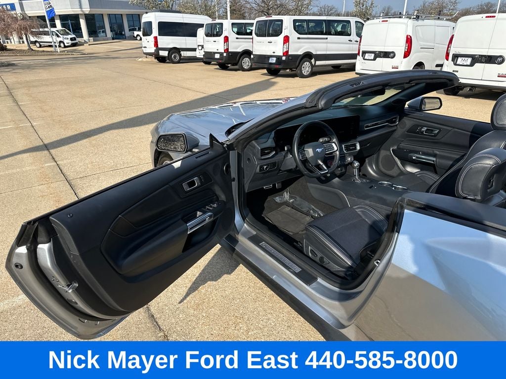 Nick Mayer Ford East Wickliffe is proud to offer this gorgeous 2025 Ford Mustang in Silver Metallic This vehicle has been thoroughly inspected, ready to take home, and comes with the following features; Equipment Group 200A Standard Package, Security Package (Active Anti-Theft System, Locking Center Console, and Wheel Locking Kit), 4-Wheel Disc Brakes, 9 Speakers, ABS brakes, ActiveX Bucket Seats, Air Conditioning, Alloy wheels, AM/FM radio: SiriusXM with 360L, AM/FM Stereo, Auto High-beam Headlights, Auto-dimming Rear-View mirror, Automatic temperature control, Brake assist, Bumpers: body-color, Climate Controlled Heated/Cooled Front Seats, Compass, Convertible roof lining, Delay-off headlights, Driver door bin, Driver vanity mirror, Dual front impact airbags, Dual front side impact airbags, Electronic Stability Control, Emergency communication system: 911 Assist, Exterior Parking Camera Rear, Four wheel independent suspension, Front anti-roll bar, Front Bucket Seats, Front Center Armrest, Front dual zone A/C, Front reading lights, Fully automatic headlights, Glass rear window, HD Radio, Heated door mirrors, Heated front seats, Heated steering wheel, Illuminated entry, Internet access capable: FordPass Connect, Knee airbag, Leather Shift Knob, Leather steering wheel, Low tire pressure warning, Occupant sensing airbag, Outside temperature display, Overhead console, Panic alarm, Passenger door bin, Passenger vanity mirror, Power convertible roof, Power door mirrors, Power driver seat, Power passenger seat, Power steering, Power windows, Radio data system, Rain sensing wipers, Rear anti-roll bar, Rear Parking Sensors, Rear window defroster, Remote keyless entry, Security system, SiriusXM w/360L, Speed control, Speed-sensing steering, Speed-Sensitive Wipers, Spoiler, Sport steering wheel, Steering wheel mounted audio controls, SYNC 4, Tachometer, Telescoping steering wheel, Tilt steering wheel, Traction control, Trip computer, Turn signal indicator mirrors, Variably intermittent wipers, Ventilated front seats, Voltmeter, and Wheels: 18 x 8 Machined-Face Aluminum.