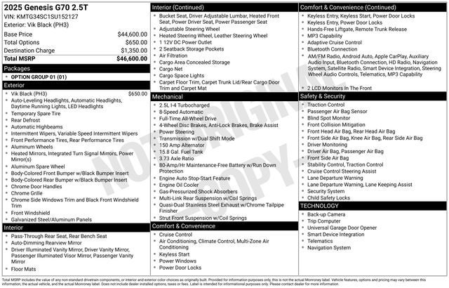 Slip behind the wheel of this meticulously crafted Genesis G70 2.5T and discover a driving experience that seamlessly blends style, performance, and technology. Schedule a test drive today and let us demonstrate how this exceptional sedan can elevate your daily commute and weekend adventures.