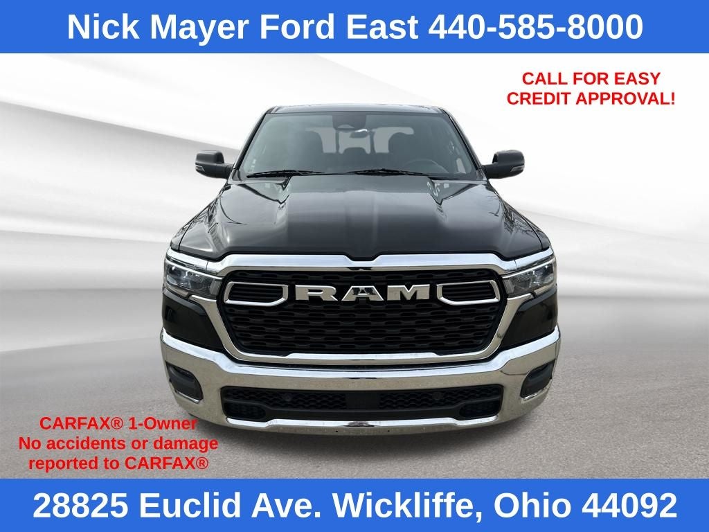 Nick Mayer Ford East Wickliffe is proud to offer this attractive 2025 Ram 1500 in Diamond Black Crystal Pearlcoat This vehicle has been thoroughly inspected, ready to take home, and comes with the following features; Big Horn Level 2 Equipment Group (115V Auxiliary Power Outlet, 115V Auxiliary Rear Power Outlet, 12 Touchscreen Display, 2nd Row In Floor Storage Bins, 400W Inverter, 4G LTE Wi-Fi Hot Spot, 9 Amplified Speakers w/Subwoofer, Air Conditioning ATC w/Dual Zone Control, Apple CarPlay, Auto Power-Folding Mirrors, Auto-Dimming Exterior Driver Mirror, Auto-Dimming Rear-View Mirror, Black Exterior Mirrors, Black Premium Power Mirrors, Cluster 7.0 TFT Color Display, Configurable Drive Mode, Connected Travel & Traffic Services, Connectivity - US/Canada, Convex Wide-Angle Exterior Mirror Insert, Exterior Mirrors Courtesy Lamps, Exterior Mirrors w/Heating Element, Exterior Mirrors w/Supplemental Signals, Glove Box Lamp, Google Android Auto, GPS Antenna Input, GPS Navigation, HD Radio, Heated Front Seats, Heated Steering Wheel, Integrated Voice Command w/Bluetooth®, Leather Wrapped Steering Wheel, LED Dome Lamp w/On/Off Switch, LED Footwell Lighting, Media Hub w/2 Charge Only USBs, Overhead LED Lamps, Power 2-Way Driver Lumbar Adjust, Power Adjust 8-Way Driver Seat, Power Adjustable Pedals, Premium Overhead Console, Radio: Uconnect 5 Nav w/12.0 Display, Rear Power Sliding Window, Rear Window Defroster, Remote Tailgate Release, Security Alarm, SiriusXM w/360L, Steering Wheel Mounted Audio Controls, Sun Visors w/Illuminated Vanity Mirrors, Universal Garage Door Opener, and USB Host Flip), Quick Order Package 21Z Big Horn, 3 Rear Seat Head Restraints, 3.21 Rear Axle Ratio, 3.55 Rear Axle Ratio, 4 Way Front Headrests, 4-Wheel Disc Brakes, 6 Speakers, ABS brakes, Air Conditioning, Alloy wheels, AM/FM radio, Apple CarPlay/Android Auto, Auto High-beam Headlights, Brake assist, Bumpers: chrome, Cloth Bench Seat, Compass, Delay-off headlights, Driver door bin, Dual front impact airbags, Dual front side impact airbags, Electronic Stability Control, Front anti-roll bar, Front Center Armrest w/Storage, Front fog lights, Front License Plate Bracket, Front reading lights, Front Seat Back Map Pockets, Front wheel independent suspension, Fully automatic headlights, Heated door mirrors, Illuminated entry, Low tire pressure warning, Manual Adjust 4-Way Front Passenger Seat, Manual Folding Exterior Mirrors, Manufacturer's Statement of Origin, Occupant sensing airbag, Outside temperature display, Overhead airbag, Overhead console, Panic alarm, ParkView Rear Back-Up Camera, Passenger door bin, Passenger vanity mirror, Power door mirrors, Power steering, Power windows, Radio data system, Radio: Uconnect 5 W w/8.4 Display, RAM Grille Badge - Chrome, Rear 60/40 Folding Seat, Rear anti-roll bar, Rear seat center armrest, Rear step bumper, Remote keyless entry, Speed control, Split folding rear seat, Supplier Part Tracking (J-1), Tachometer, Telescoping steering wheel, Tilt steering wheel, Traction control, Trip computer, Variably intermittent wipers, Voltmeter, and Wheels: 18 x 8 Cast-Aluminum Painted.